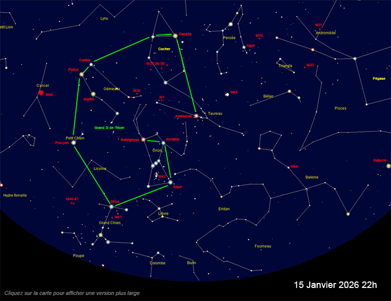 époque : Aldébaran, Capella, Castor, Pollux, Procyon (non visible sur la carte), Sirius, Rigel, Bellatrix et Betelgeuse. On peut remarquer les différences de nuances entre ces étoiles, certaines étant plutôt orangées (Aldébaran et