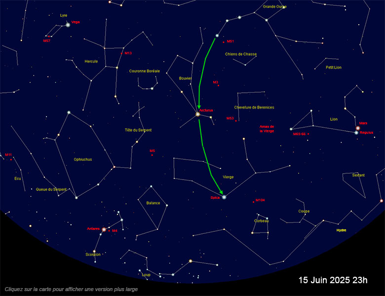 ce qui permet de situer les constellations du Bouvier et de la Vierge. La galaxie indiquée ci-dessous se trouve en fait dans les Chiens de Chasse mais on la trouve depuis Alkaïd. Elle est double (une grosse galaxie « capturant » une